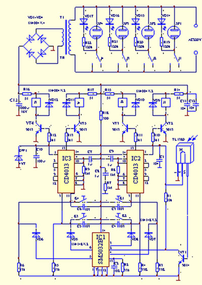 当IC1;SM5032B的4个非锁存输出端中任何一个只要出现电平的上升沿,对应的双稳态电路的工作状态就翻转一次,即可控制与之相接的三极管的工作状态,如果原是饱和状态,则可变为截止状态;如果原是截止状态,则可变为饱和状态。这就可控制继电器的吸合和释放,实现对受控电器的“开”、“关”控制。